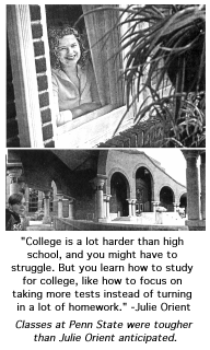 Like Ruprecht, Orient also spent five weeks at home recovering from illness, a kidney infection coupled with the flu. She considered withdrawing, but managed to return to school, make up the work, and-to her surprise and delight-get better grades than in the fall semester.